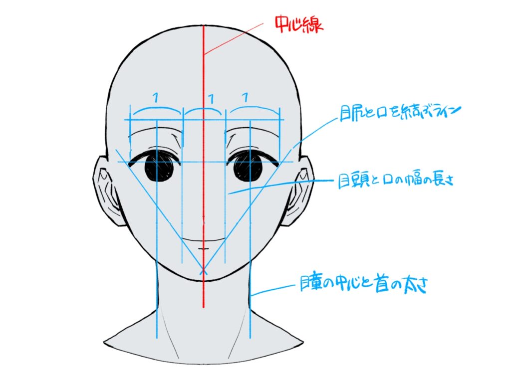 バランスの良い顔を描くために、顔の黄金比率を意識してみましょう。以下の比率を目安にすると整いやすくなります。
