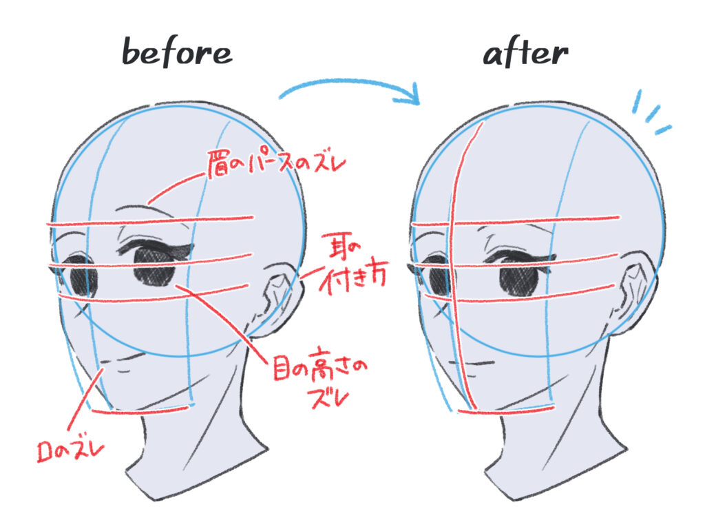左右の高さにズレが生じるときは、顔のパース(遠近感・角度)を見失っている可能性があります。