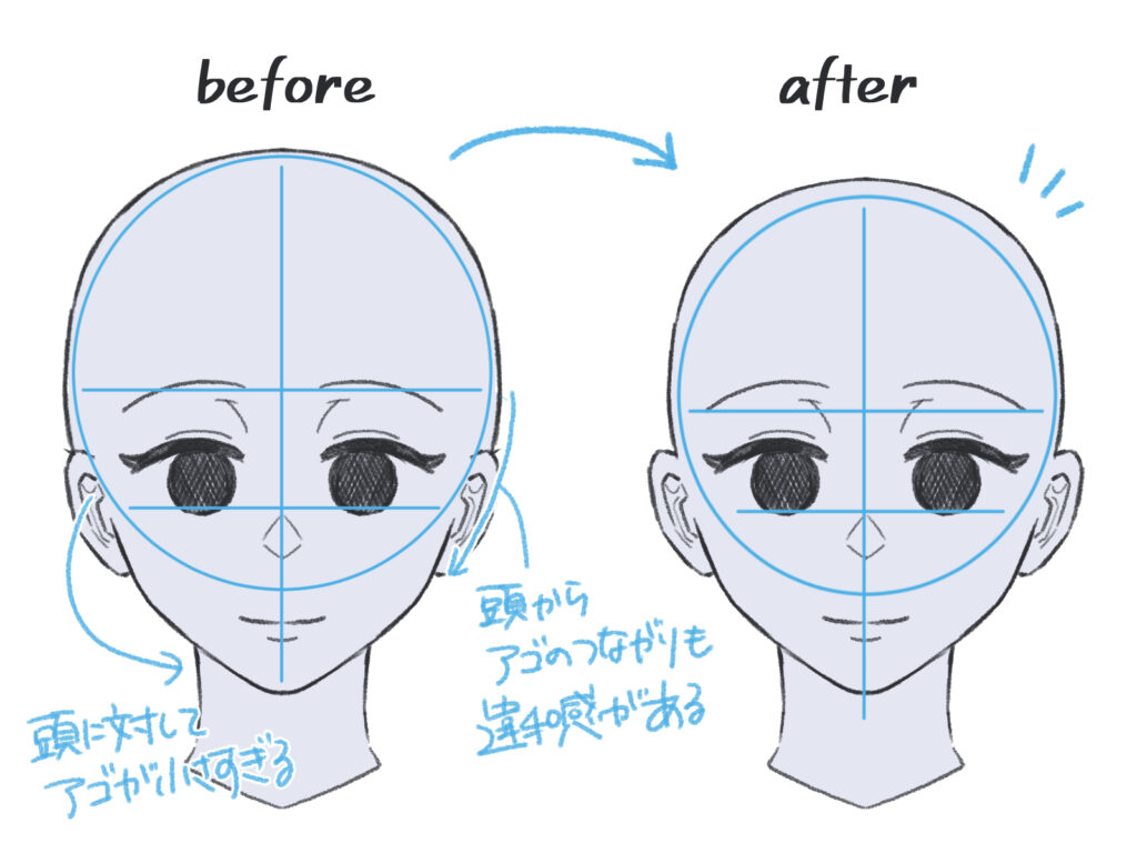 目と耳、鼻の位置関係が正面を向いているか常に意識し、目の高さ・口・あごが一直線上でズレがないように描いてみてください。