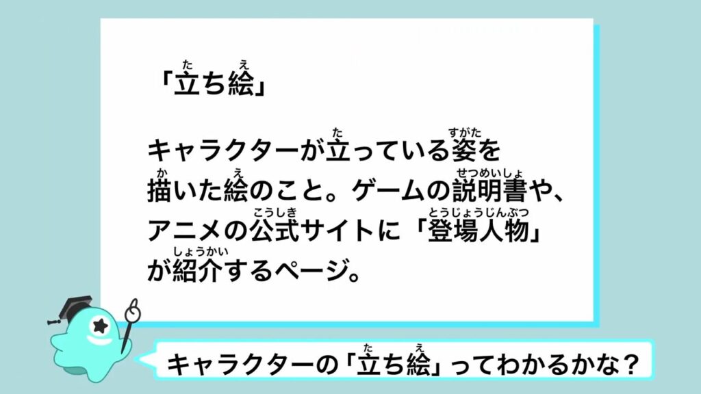 立ち絵(たちえ)とは、キャラクターが立っている姿を描いたイラストのことです。ゲームやアニメ、マンガでよく使われ、主にキャラクターの見た目や性格をイラストでわかりやすく見せるために描かれるものです。