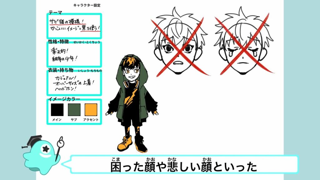 この子は、「あかるい性格」で、配色で「カッコイイ感じ」を表現しているキャラクターです。明るさ、カッコ良さといったこのキャラクターの個性に注目しましょう。