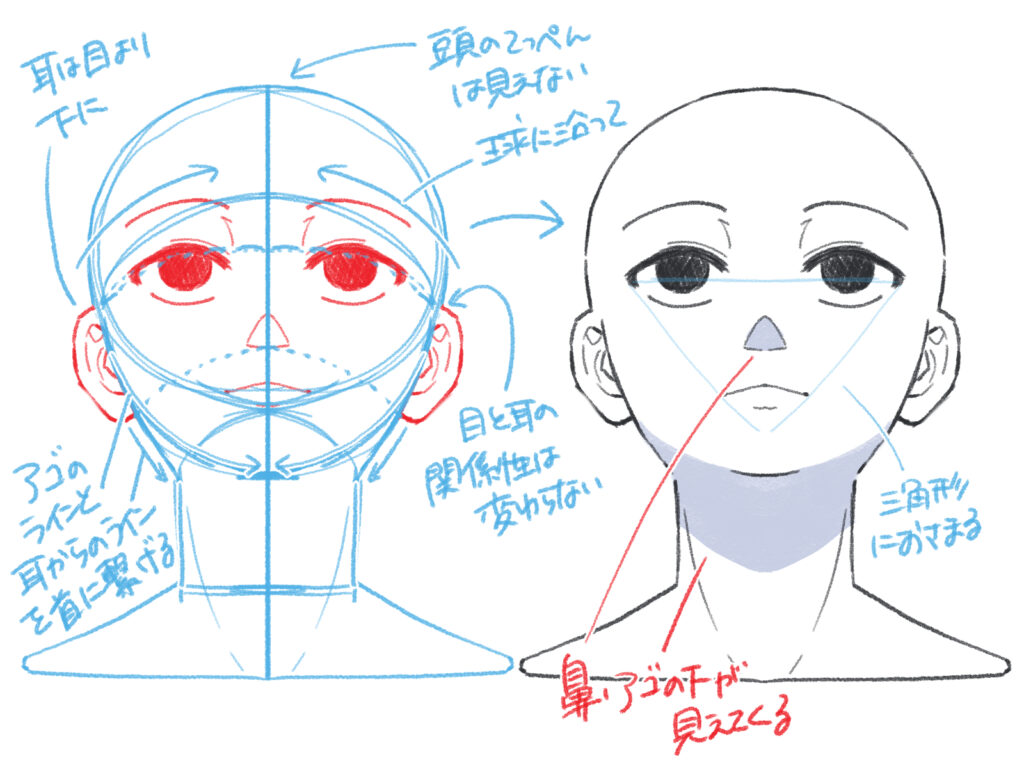 描いたイラストが「どこか変だ」と感じるときは、これらのパーツの位置関係がズレている可能性が高いです。特に正面から顔を描く場合は、左右のバランス(シンメトリー)を意識することが重要です。