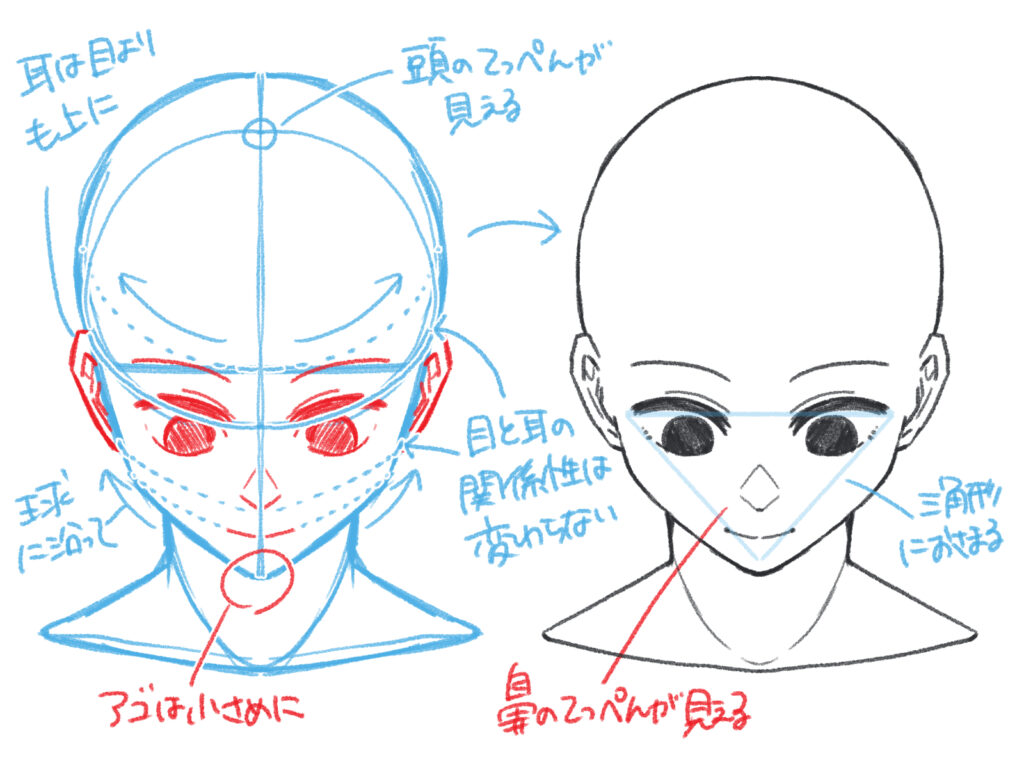両目の中心と、口の中心を結んだときに「正三角形」になるバランスを意識してください。ここが崩れて二等辺三角形(縦長すぎる、横長すぎる)になると、顔のバランスが悪く見えてしまいます。