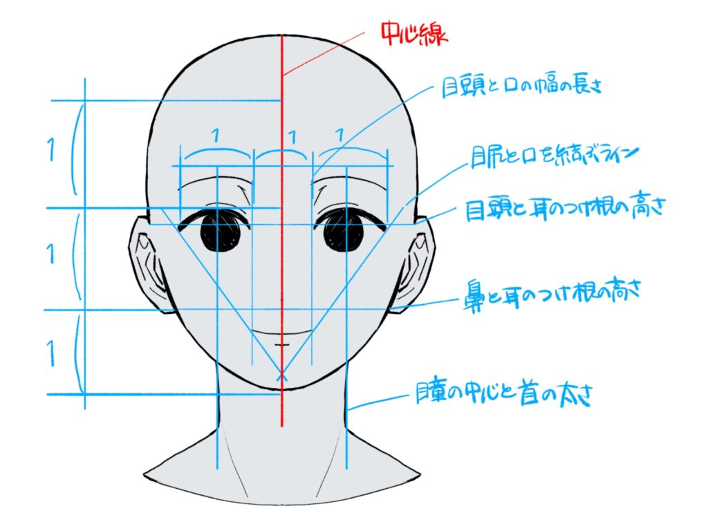 この比率を基準にして描くことで、バランスの整った顔のパーツ配置が可能になります。