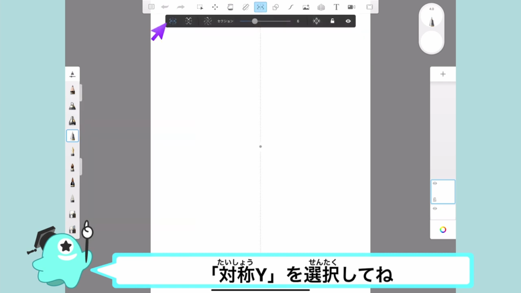 まずはリボンの線画を描いていきましょう。描画スタイルの「対称」をタップして、「対称Y」を選択してください。