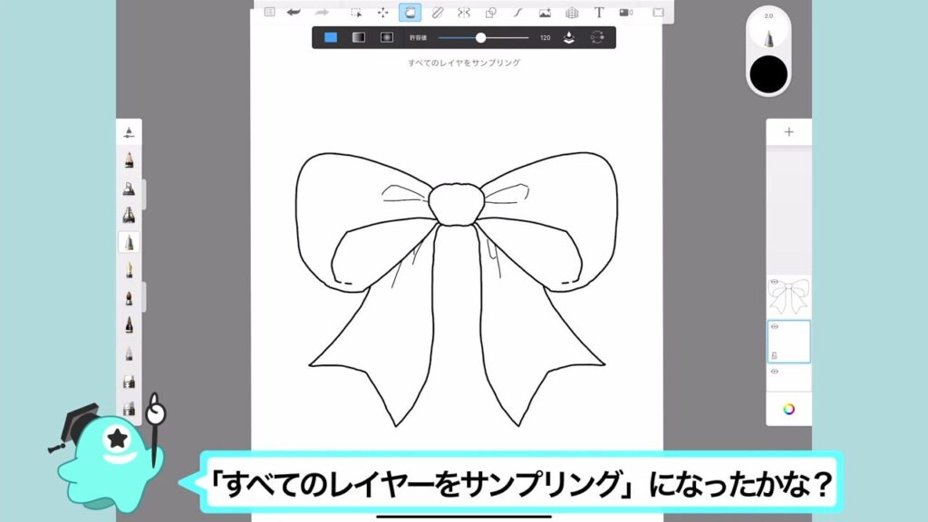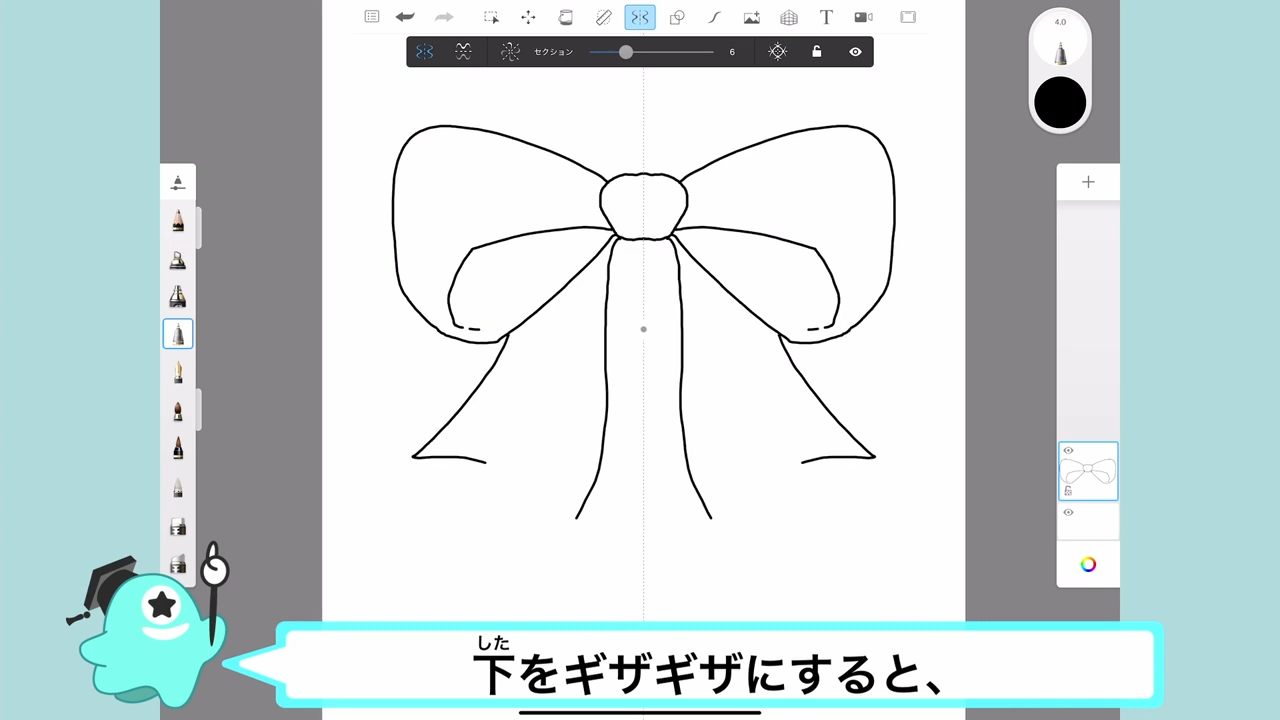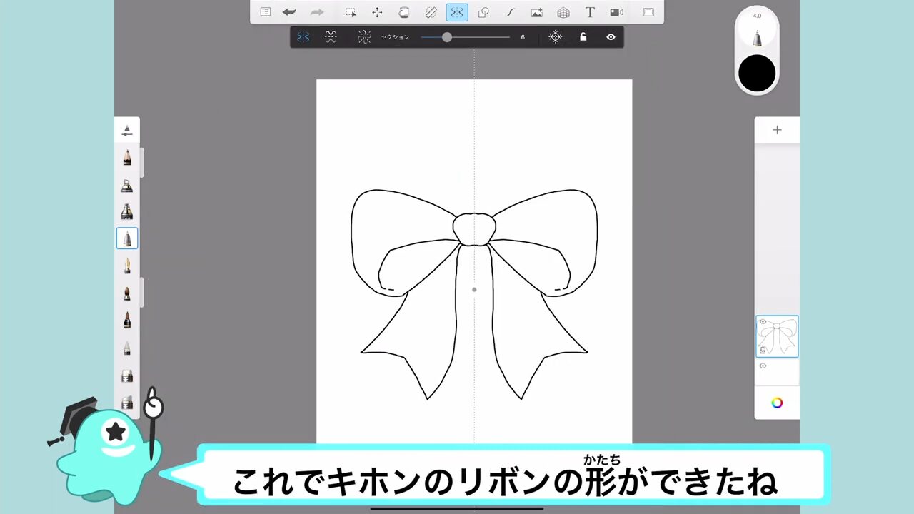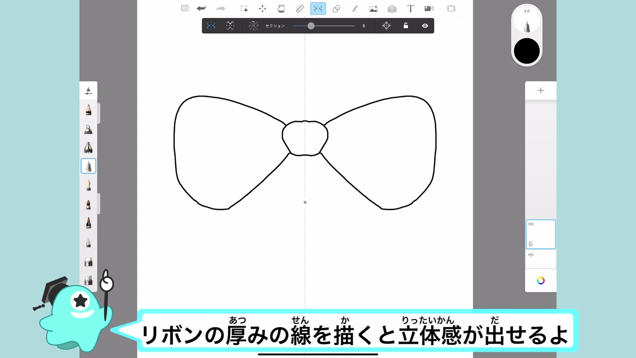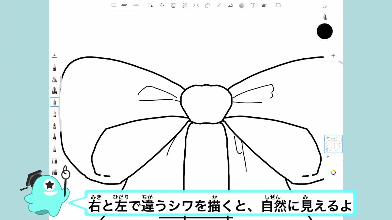 シワの線は、リボンのりんかく線よりも細くして、線にメリハリをつけていこう!
