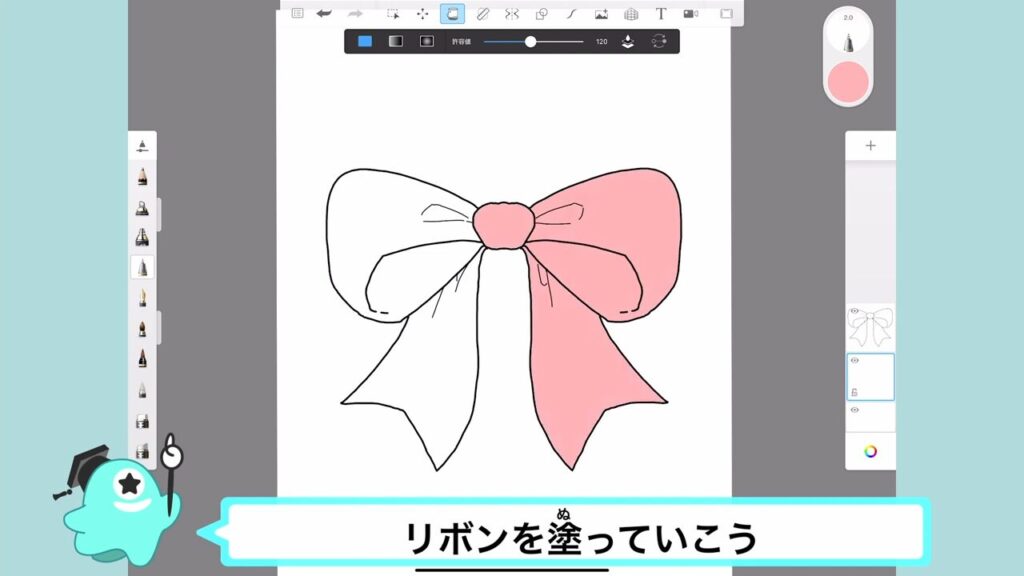 ここからさらにリボンのシワを描くと、もっと自然な形に見えるよ!