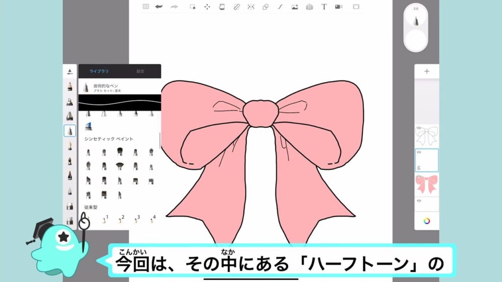 ペンツールを押してライブラリを開いたら、今回はその中にある「ハーフトーン」のドット模様をリボンにつけていこう。