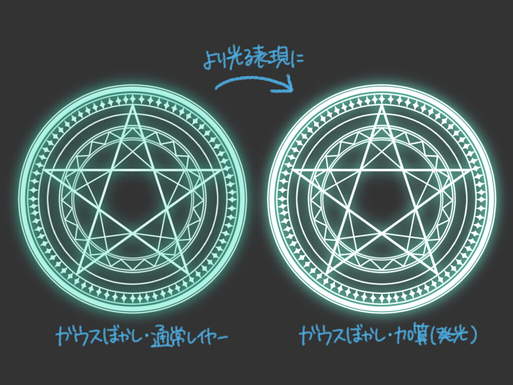 通常の塗りやガウスぼかしだけではぼんやり光っている状態ですが、レイヤーモードを「加算(発光)」に変えることで、内側から光が溢れるような強い発光表現が可能になります。 特に、強いハイライトや魔法、エネルギー弾などの光るエフェクトを描く際に必須のレイヤー効果です。