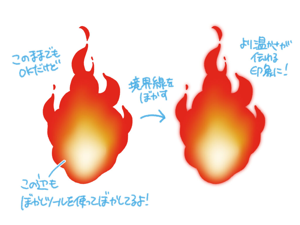 例えば、炎のイラストを描くとき、輪郭をくっきり描いたままにするよりも、炎全体の境界線をぼかすことで、熱気や温かさが伝わるリアルな印象になります。 ただし、ふんわりと色が乗るエアブラシやぼかしツールを多用しすぎると、イラスト全体がボケてメリハリのない印象になりやすいため、ピントを合わせたい部分はシャープに残すなど、注意して使いましょう。