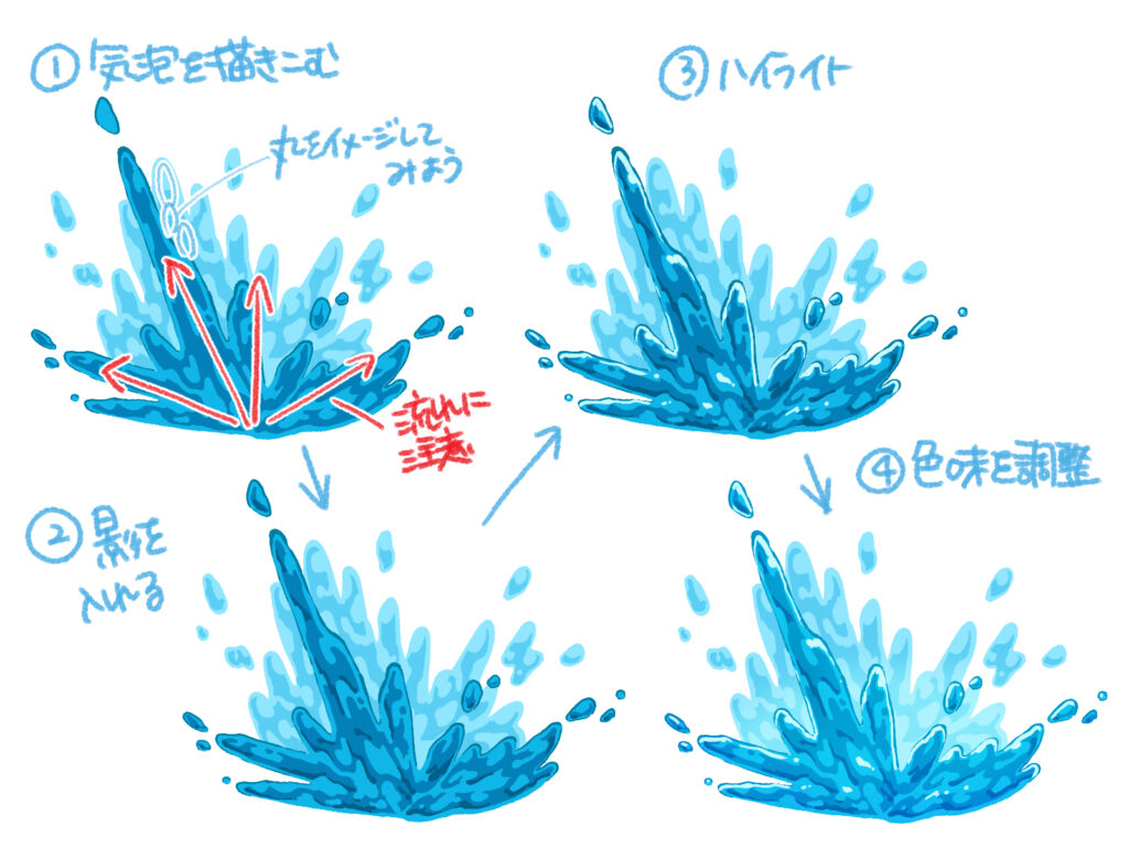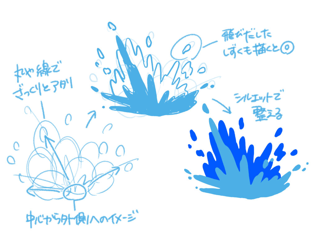 水のエフェクトは、流れと透明感がポイントです。ここでは水しぶき(スプラッシュ)の描き方を紹介します。