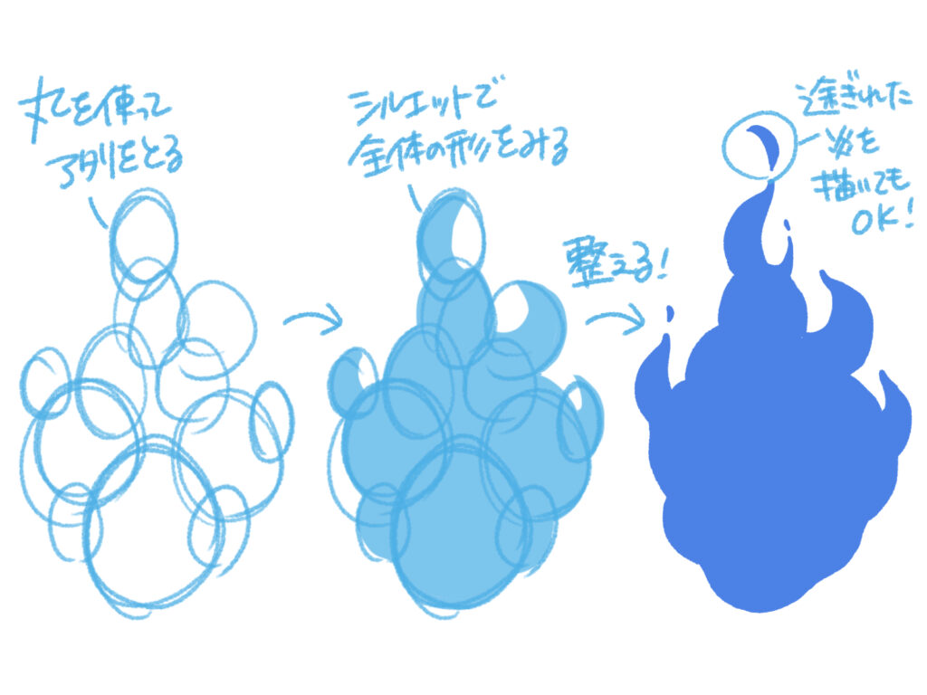 炎を描くときは、まず丸を使ってアタリをとってみましょう。 そこから上に向かって細く揺らめきながら伸びていくイメージでアタリを描き足します。