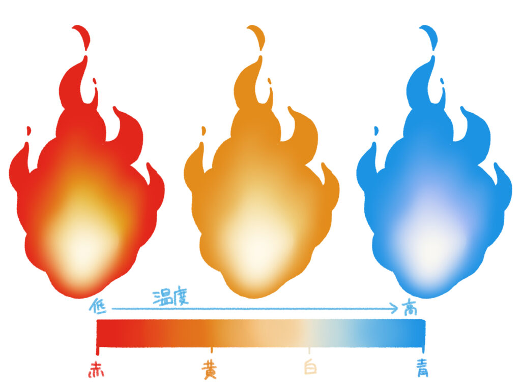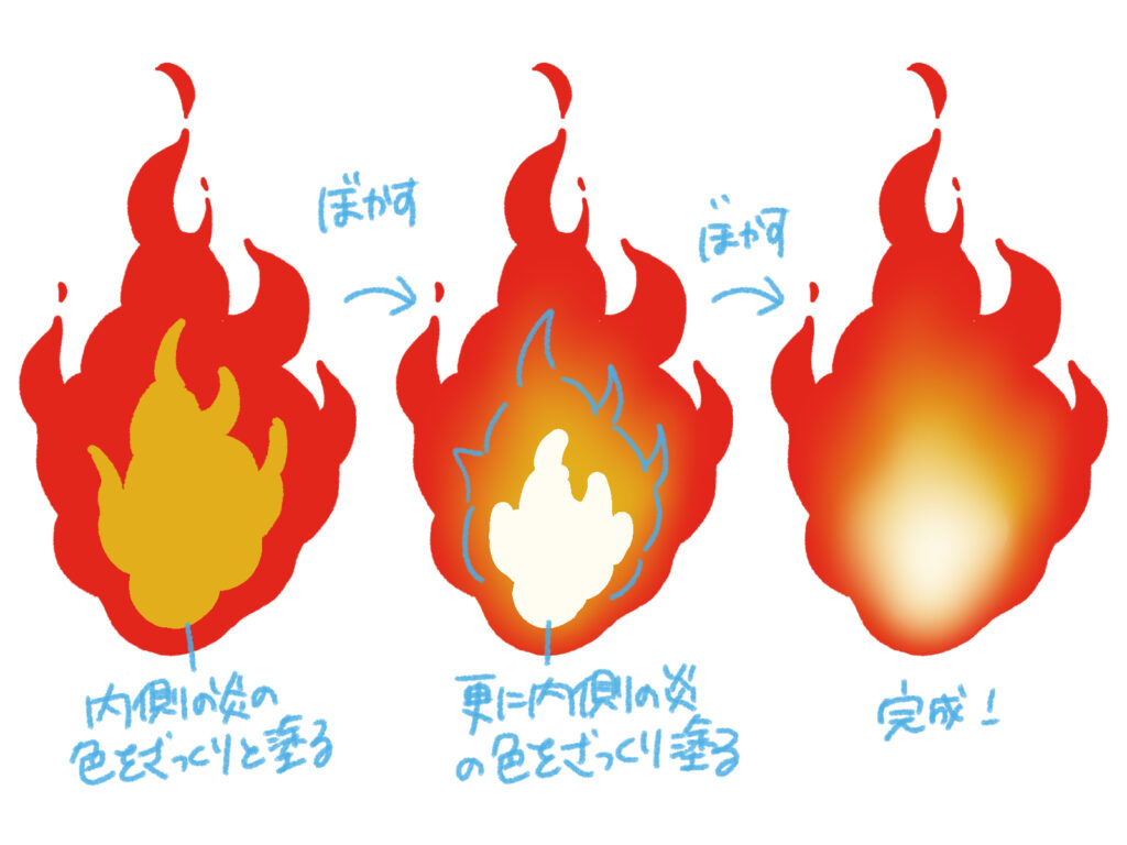 炎(火)は温度によって色が変化します。描きたいシチュエーションに合わせて色を選んでみましょう。