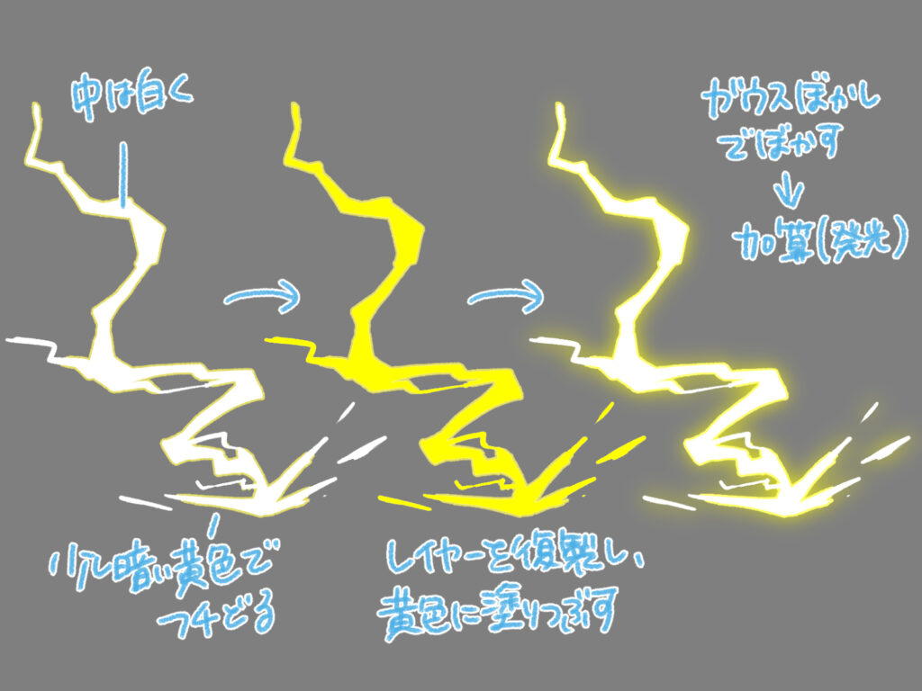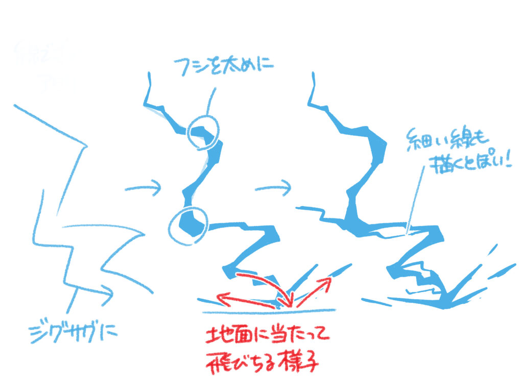 雷はスピード感と鋭さが重要です。地面に落ちる雷と、帯電している雷の2パターンを解説します。