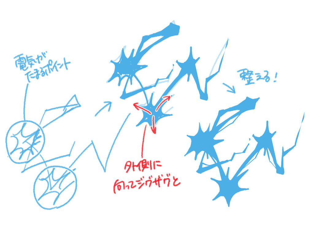 まず帯電・スパークのアタリは、雷が溜まるポイントを決め、そこを中心にバチバチさせます。このとき、外側に向かって鋭く飛び出す、角度の急なジグザグを描くイメージで形を描きましょう。