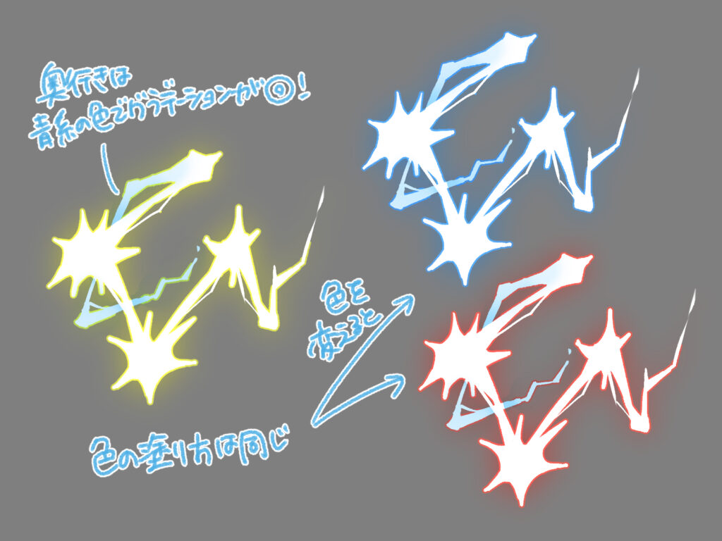 帯電・スパークスの色を塗る場合も、色の塗り方は基本的に、地面に落ちる雷と同じです。 さらにクオリティを上げるなら、奥行きを意識してみましょう。奥にある雷に「青系のグラデーション」をかけると、空間の広がりが表現できます。