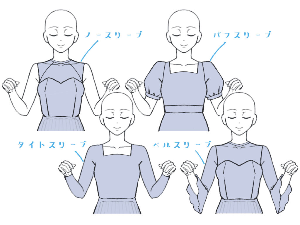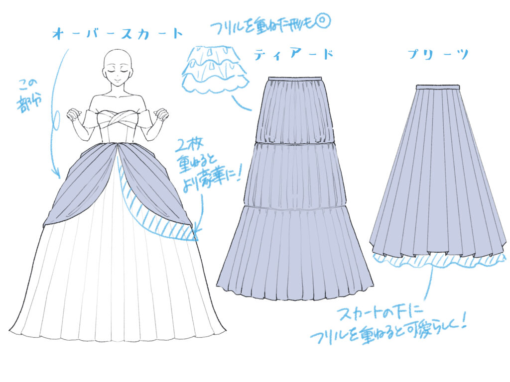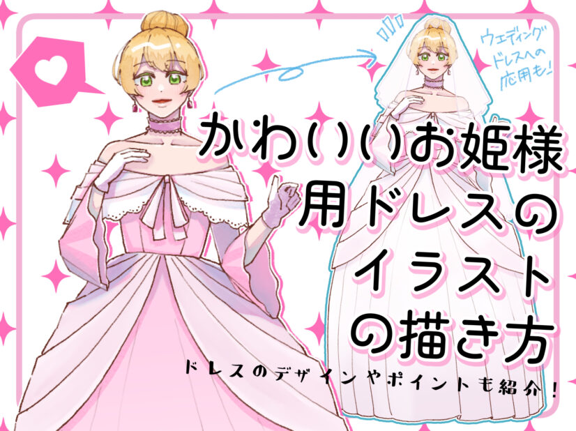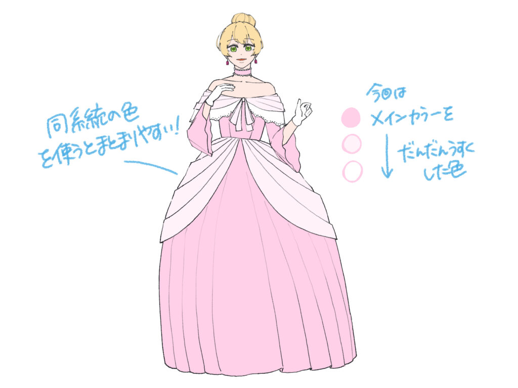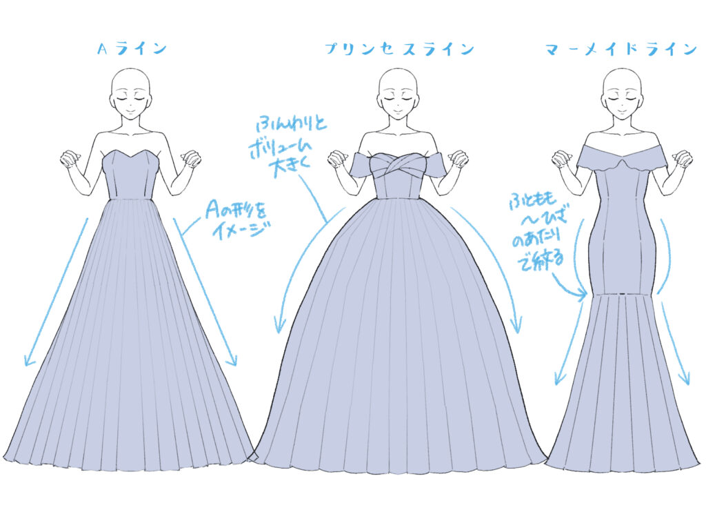 この記事では、ドレスのデザインの種類(シルエット・袖・襟)の知識から、デジタルイラストでの塗り方・メイキングまで、初心者の方にも分かりやすく解説します。