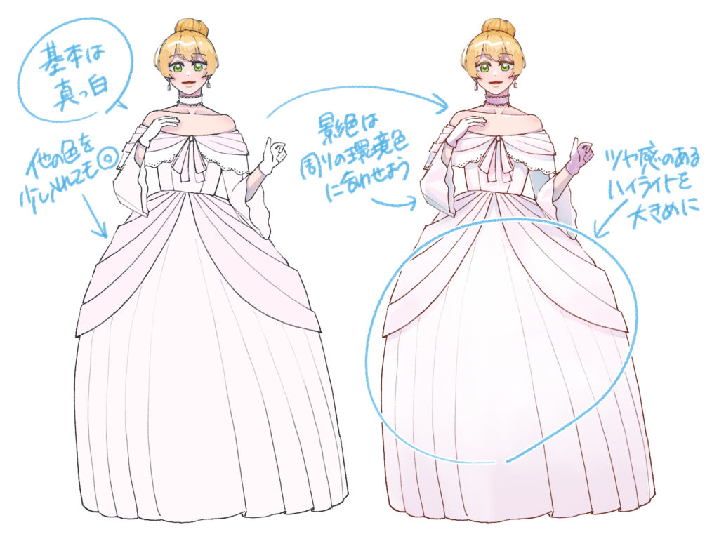 お姫様ドレスの応用として、純白のウェディングドレスの描き方も紹介します。