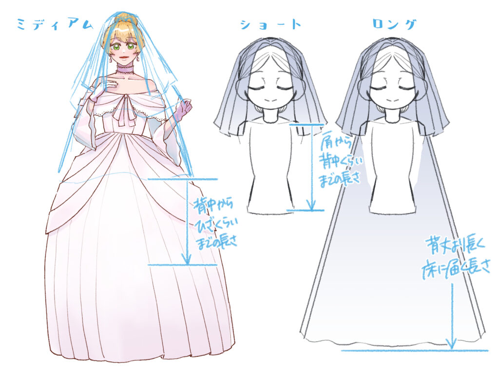 ウェディングドレスに欠かせない「ベール」には、主に3つの長さがあります。