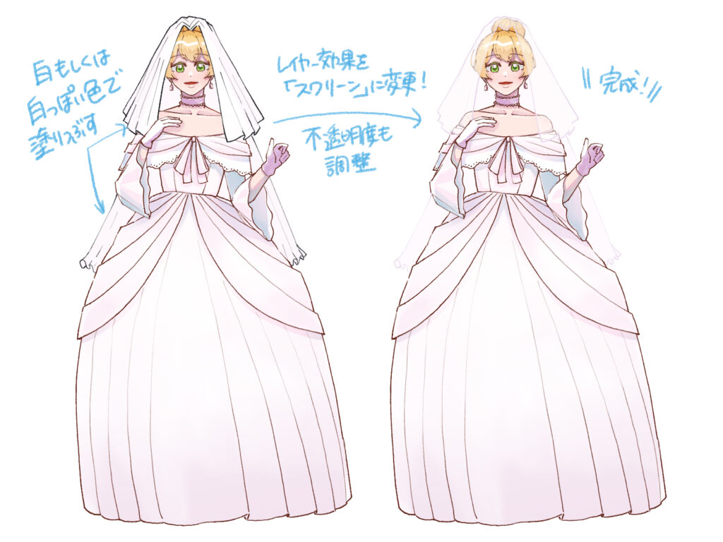 「スクリーン」モードを使うことで、下のドレスが透けて見える、透明感のあるベールを簡単に表現できます。最後にベールの線画の色を白や薄いグレーになじませたら完成です。