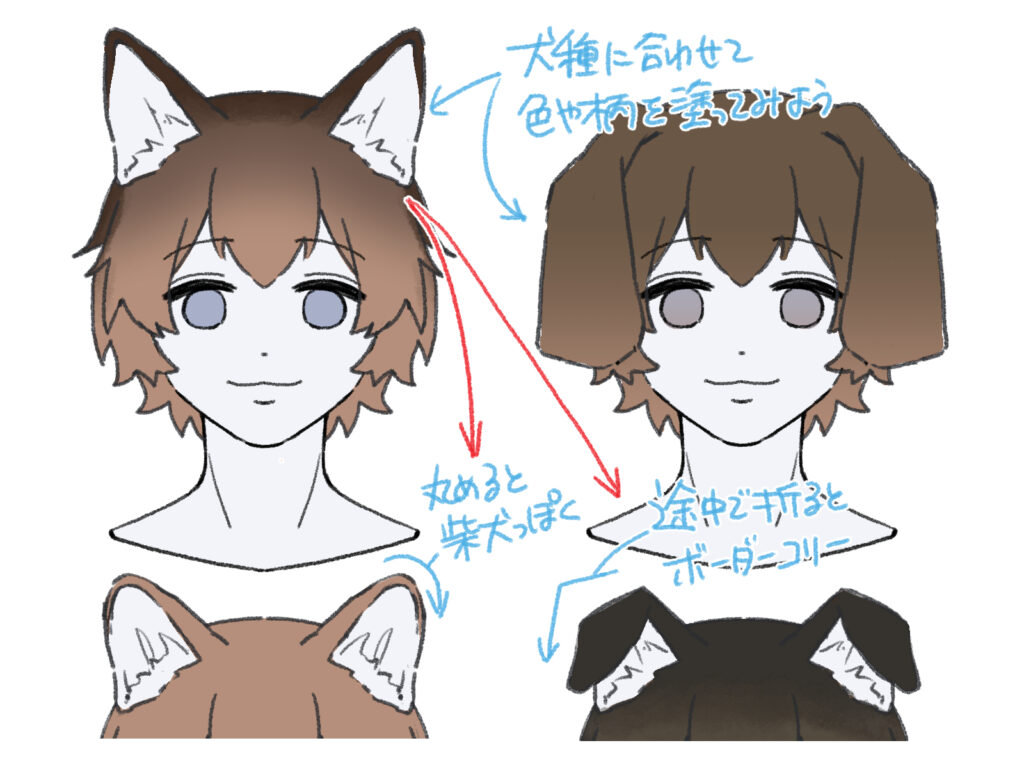 柴犬(耳先が丸い)、ボーダーコリー(途中で折れる)など、犬種特有のシルエットを観察して描き分けることで、キャラクターの個性が際立ちます。