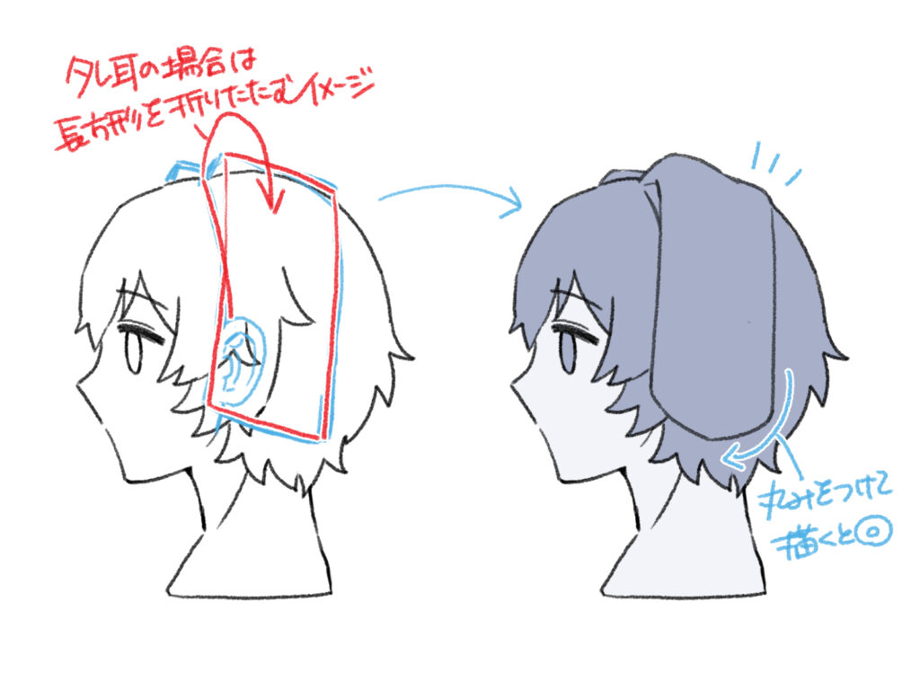 「4つ耳」の状態を避けるため、通常は人間の耳を描きません。髪のボリュームやサイドへア(もみあげ等)を利用して、元の耳の位置を自然にカモフラージュします。