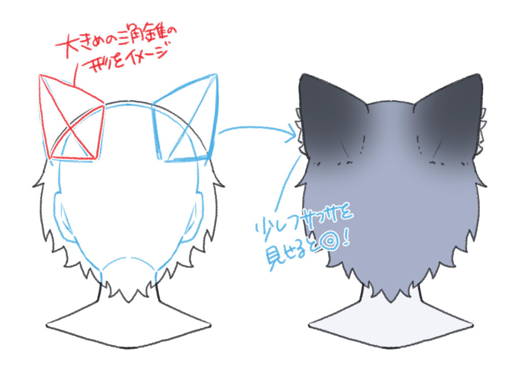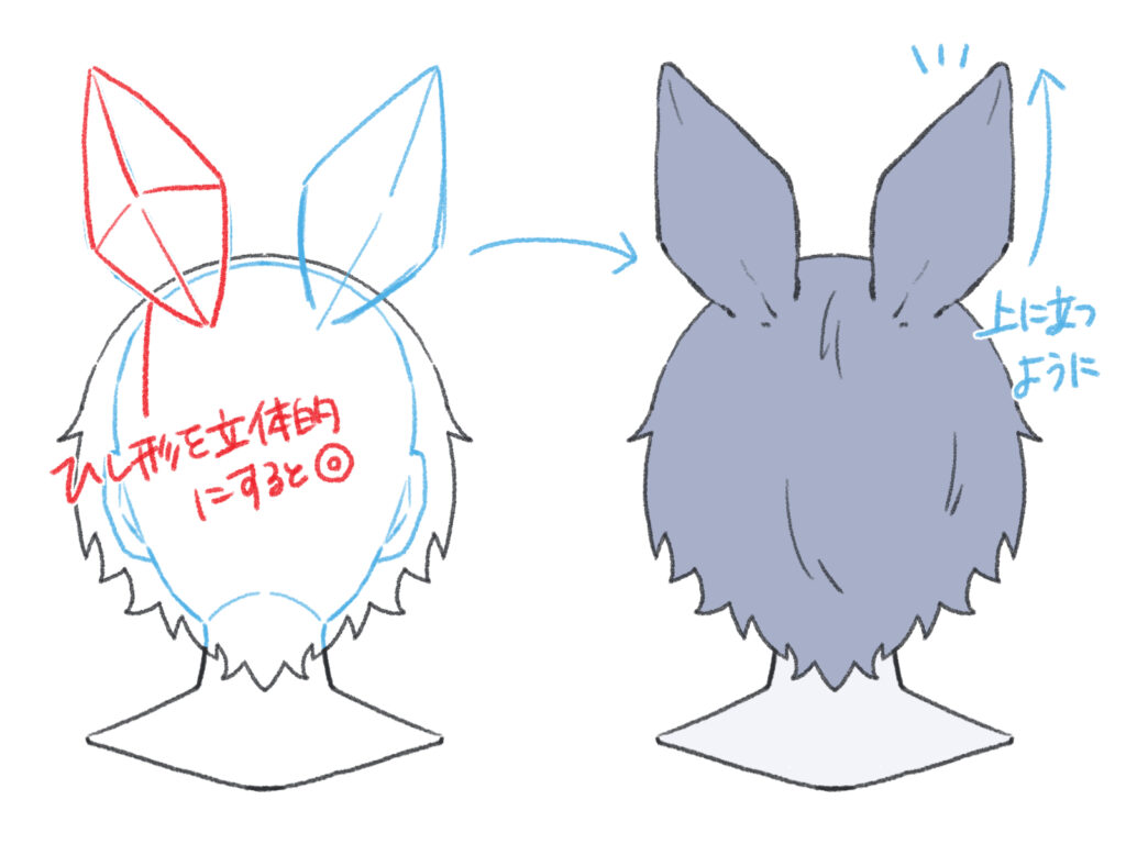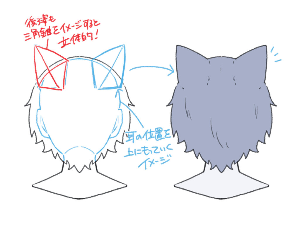 側頭部にある人間の耳の位置ではなく、頭頂部のラインに沿って配置します。パースを意識し、頭部の球体に根元が設置しているイメージで描くのがポイントです。