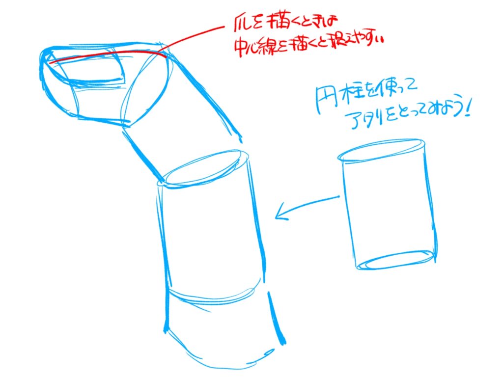 爪を描くときは、指先に中心線を引いておくと向きが定まりやすくなります。