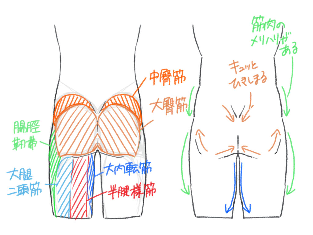 お尻の筋肉と周りの筋肉でメリハリをつけて描いていきましょう。お尻の描き方は、初心者も簡単!お尻のイラストの描き方の記事でも詳しく解説しています。