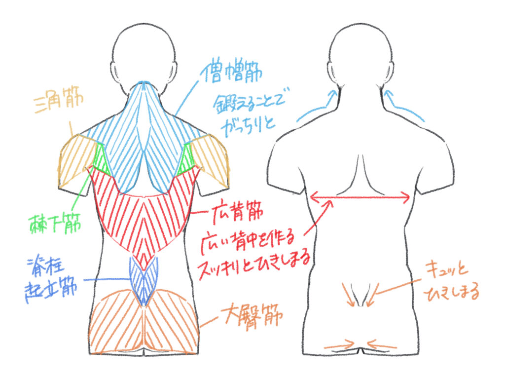 僧帽筋は首と上半身をつなぐ筋肉で、鍛えられるにつれがっちりと描いていきます。 広背筋は、鍛えられると背中が横に広がり、いわゆる「逆三角形」の体型を強調するイメージで描いてみましょう。