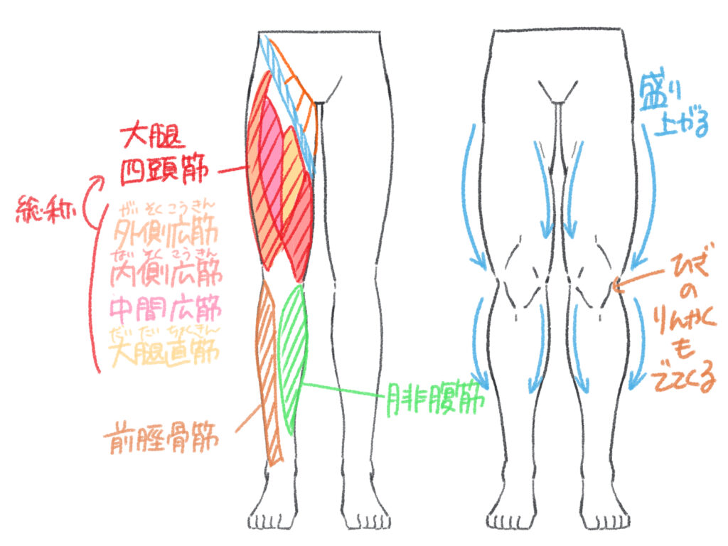 これらの筋肉が鍛えられると筋肉が盛り上がり、膝の輪郭などもはっきりと出てきます。 それぞれの筋肉の輪郭などメリハリをつけて描いていきましょう。