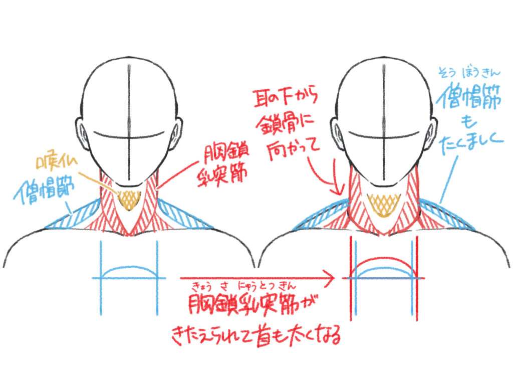 これら2つの筋肉の位置や動きに注目して首周りを描いていきましょう。首の描き方は、初心者も簡単!首のイラストの描き方の記事でも詳しく解説しています。