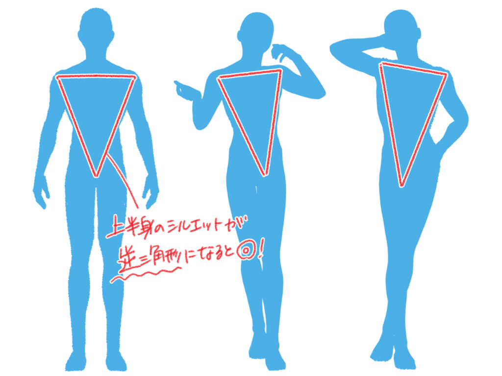 肩幅を広く、ウエストを絞った逆三角形のシルエットを意識してください。筋肉のつき方を意識することで、頼り甲斐のあるかっこいいスタイルになります。