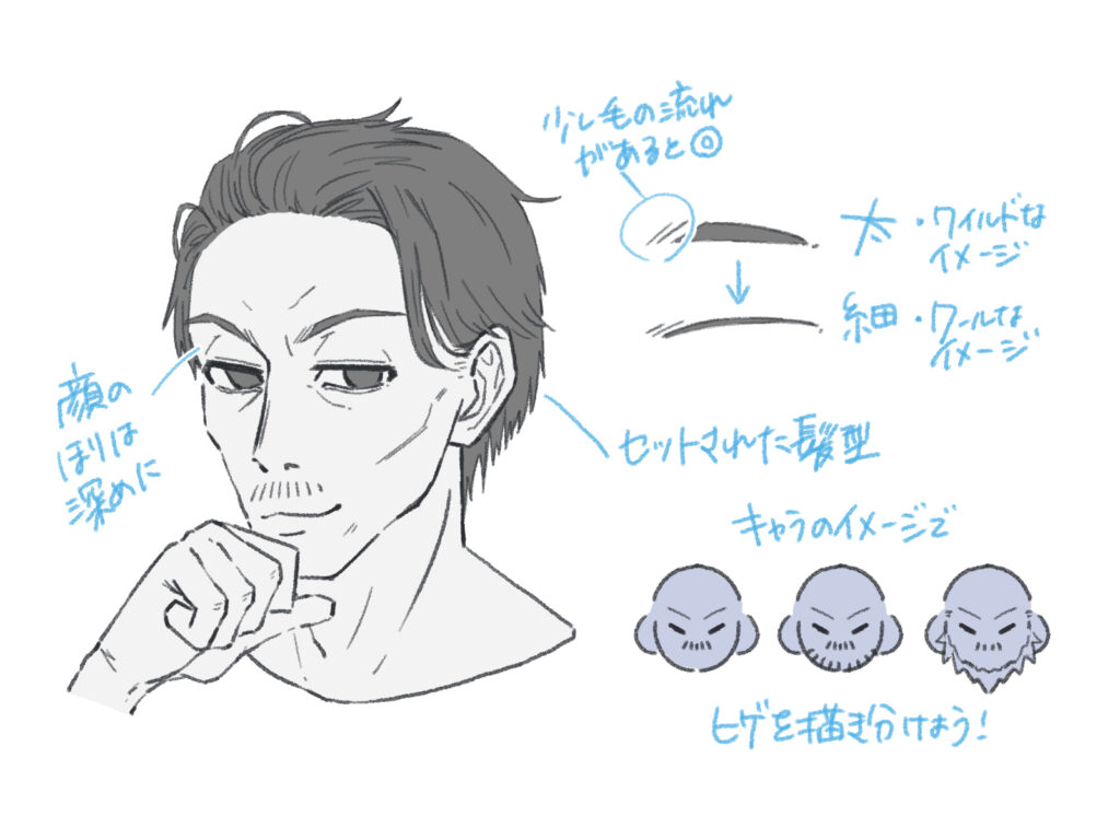 渋いイケメンおじさんを描くときは、顔の彫りが深いイメージで描きましょう。 髪型もセットされたものにします。少し髪型を崩すのもオススメです。 眉の太さやヒゲは、キャラクターのイメージに合わせて調整しましょう。