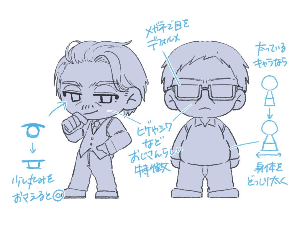 おじさんをデフォルメで描く時は、目の形を少し丸みを抑えた形にするのがオススメです。 ヒゲやシワなどおじさんらしい特徴は必ず描き加えましょう。太っているキャラなら、身体も顔と同じくらいの幅で、ふくよかに描いてみましょう。