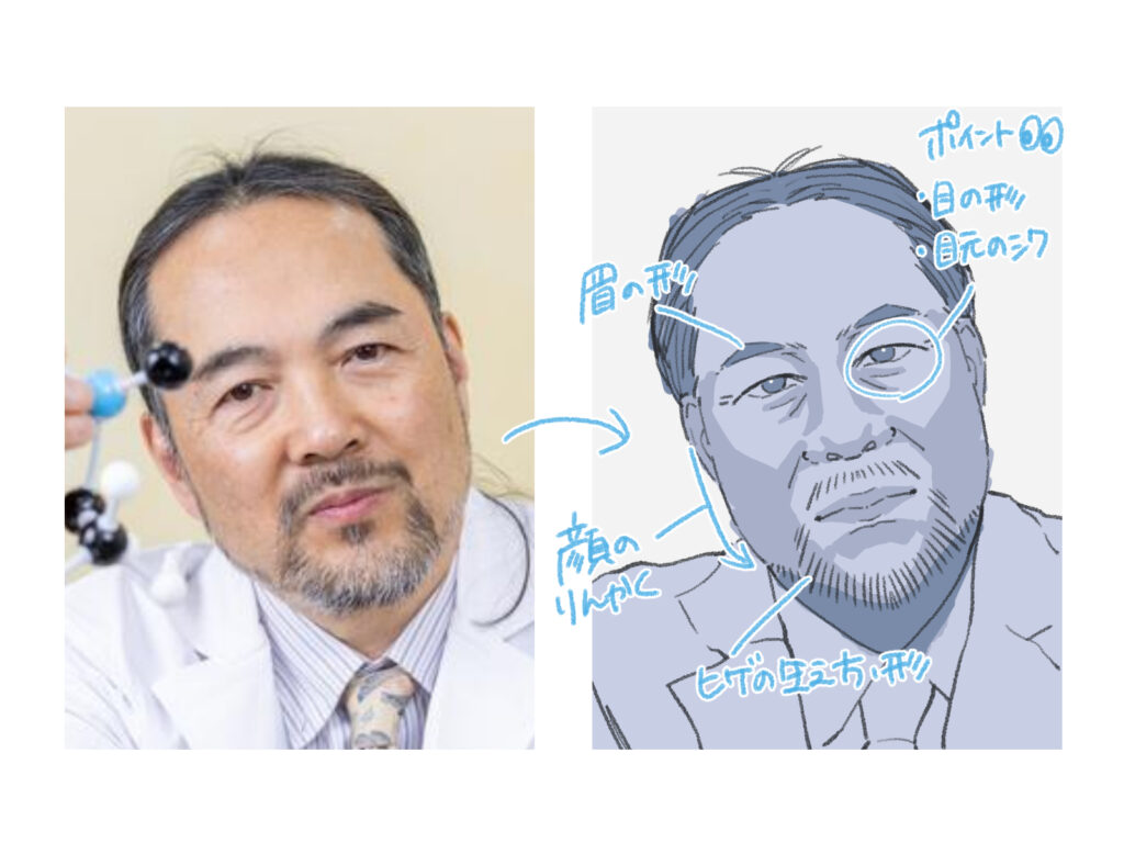 おじさんの似顔絵を描く時は、 ・目の形、目元のシワ ・眉の形 ・顔の輪郭 ・ヒゲの生え方、形 に注目して描きましょう。 目や眉の形と顔の輪郭の雰囲気をできるだけ似せていくように描くと、その人らしい印象になります。