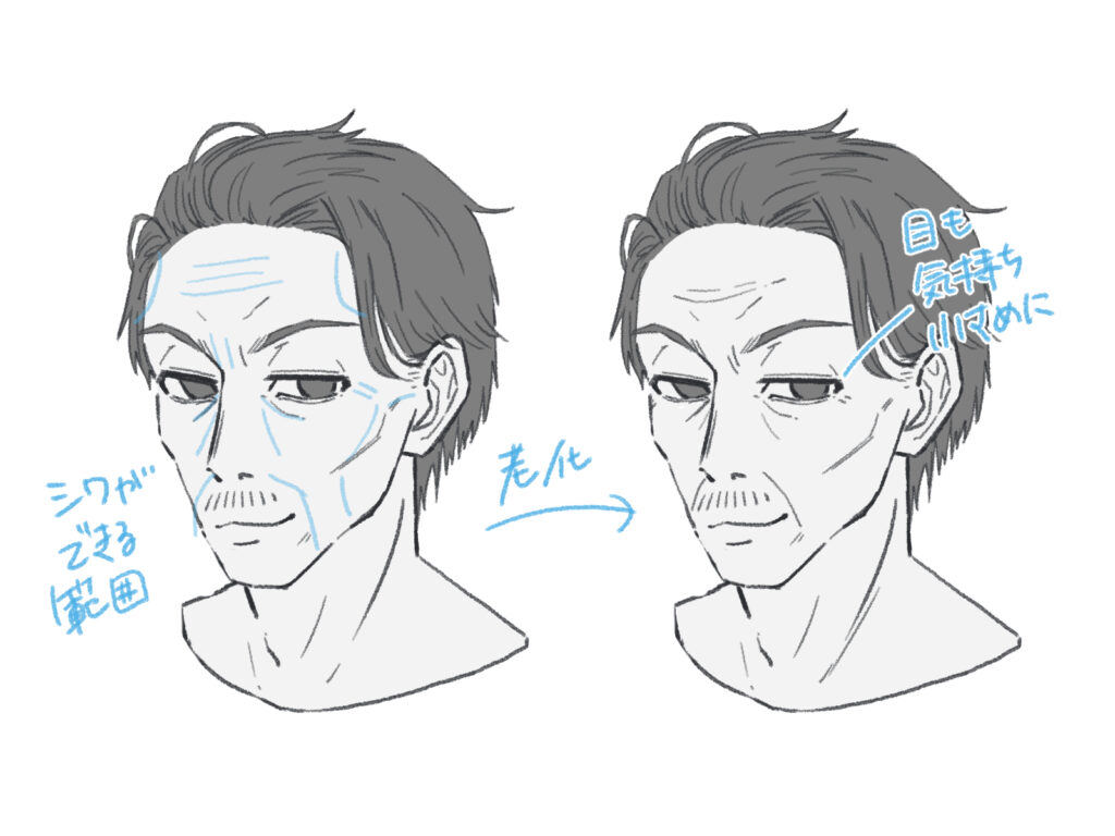 おじさんからおじいさんへ描いていくときは、シワができる範囲を考えると描きやすいです。歳を重ねるにつれてだんだんと肌がたるんでできていきます。大きなシワからだんだん小さなシワを追加していくイメージで描いてみると良いでしょう。
