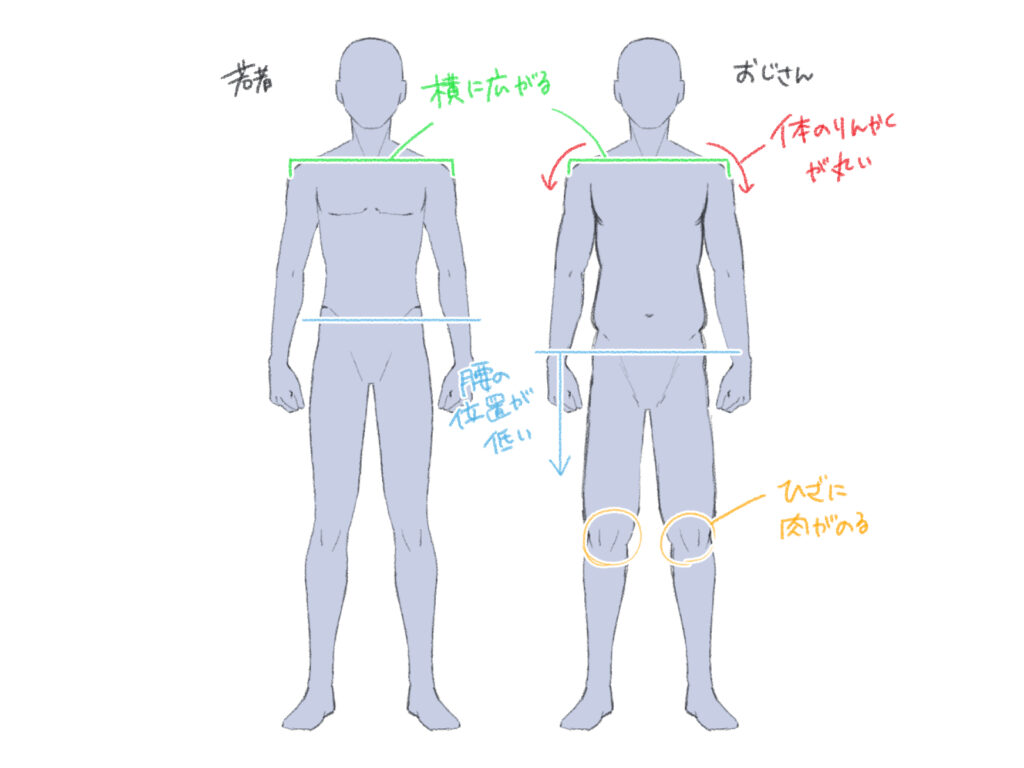 人は歳をとるにつれて肉がつきやすくなります。体の肉付きが良くなるにつれて、全体が横に広がり、大きくがっしりしたイメージで描いてみましょう。もちろん、体を鍛えているキャラクターであれば、若者のような引き締まった体付きで描いても構いません。