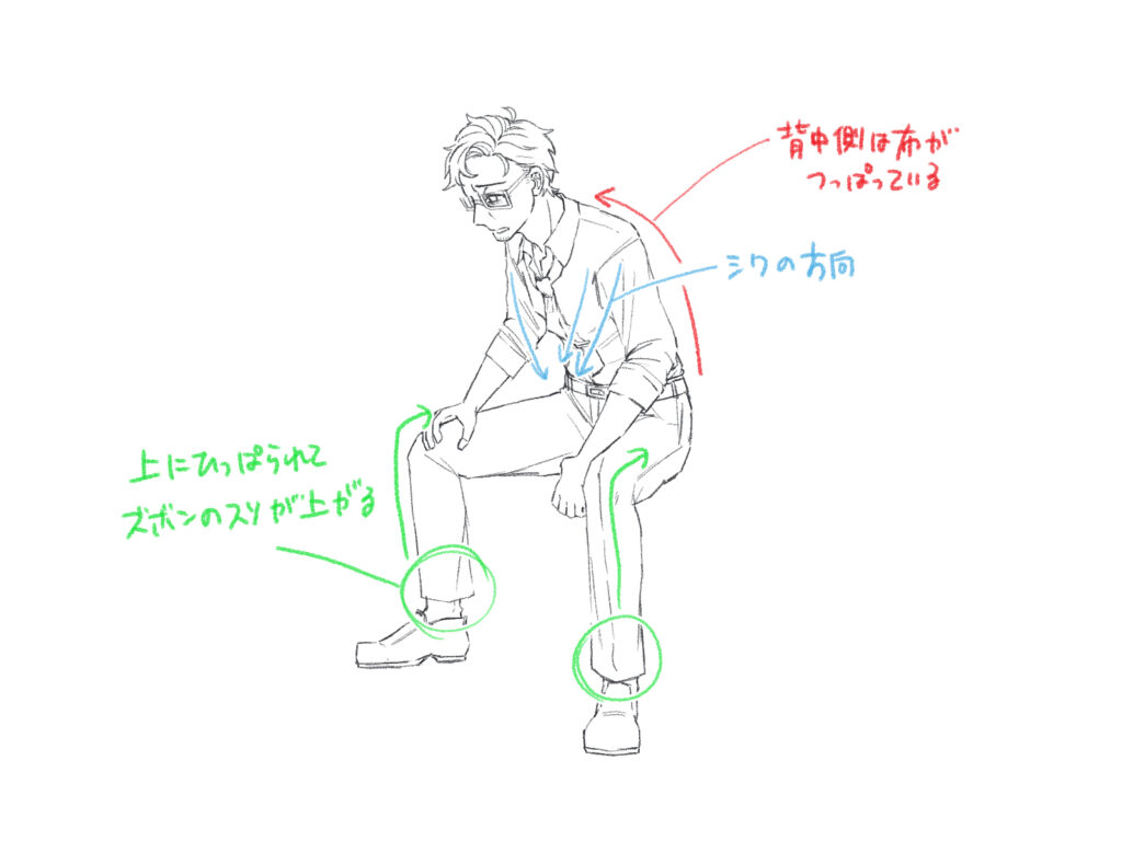 また、ズボンは座ることによって布が引っ張られ、裾が少し上がる点も表現すると良いでしょう。