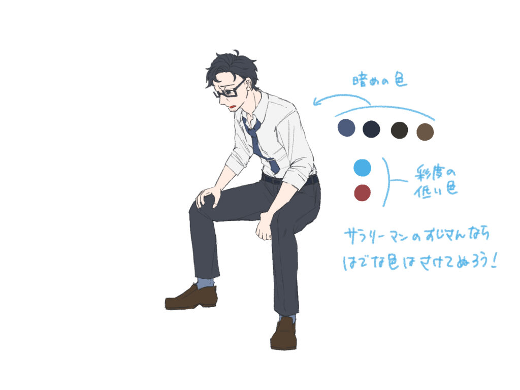 描きたいおじさんのイメージに合わせて色を塗っていきます。今回はごく一般的なサラリーマンのおじさんをイメージしているので、ネイビーやグレーなど、色味は控えめな色を中心に塗っています。