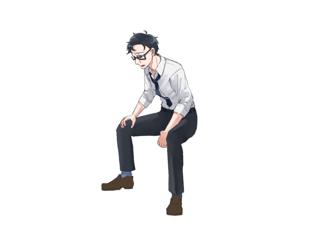 おじさんらしいポーズとしては、仕事をしている様子や、少し疲れて休んでいる様子などがオススメです。こうしたポーズは、キャラクターの背景や物語性を感じさせます。おじさんらしい肉付きの良い体型を描きたい時は、いつも通りアタリを描いた後に、お腹周りや腰回りに肉感を足していくイメージで描くと、スムーズに進められます。