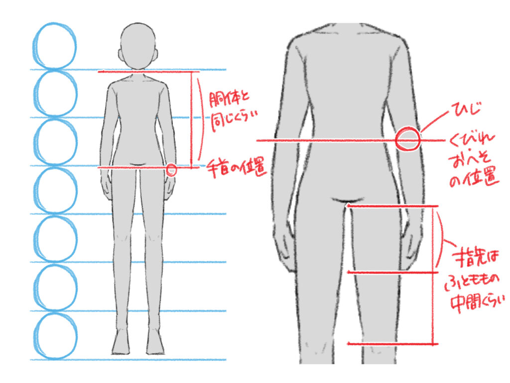 男性と女性の身体のバランスは大きく異なります。特に頭・肩・腰の比率を意識することで、より自然なシルエットを描くことができます。