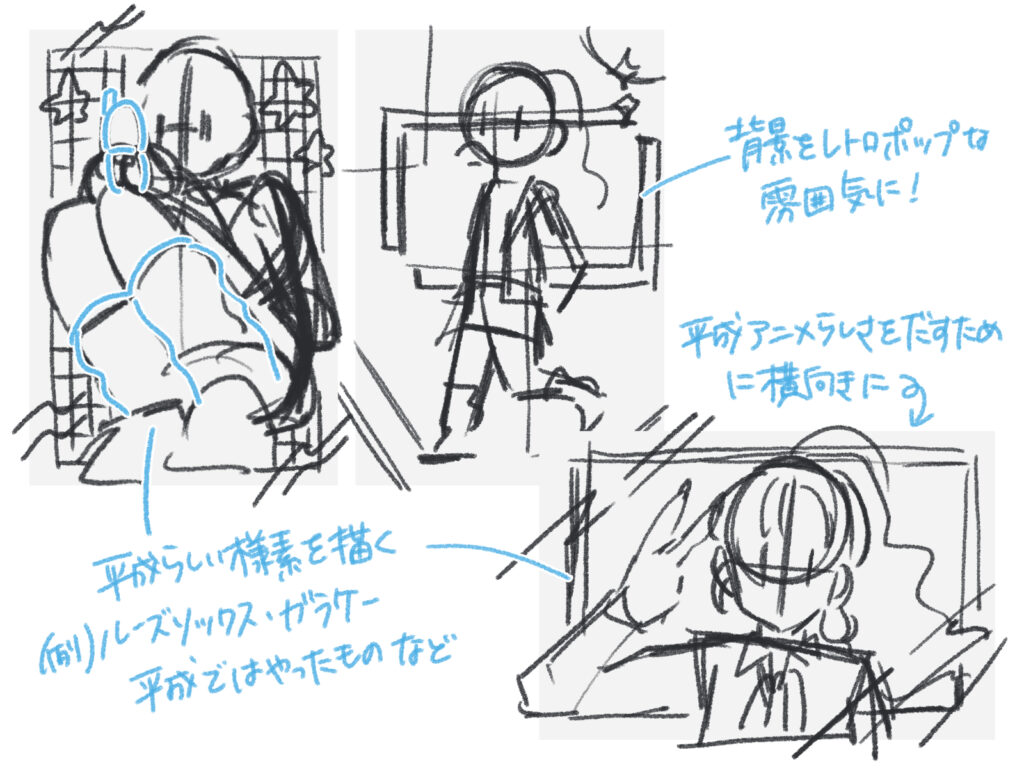 昭和・80年代風を描く際は、「シンプルさ」や「平面的な配置」を意識しましょう。
