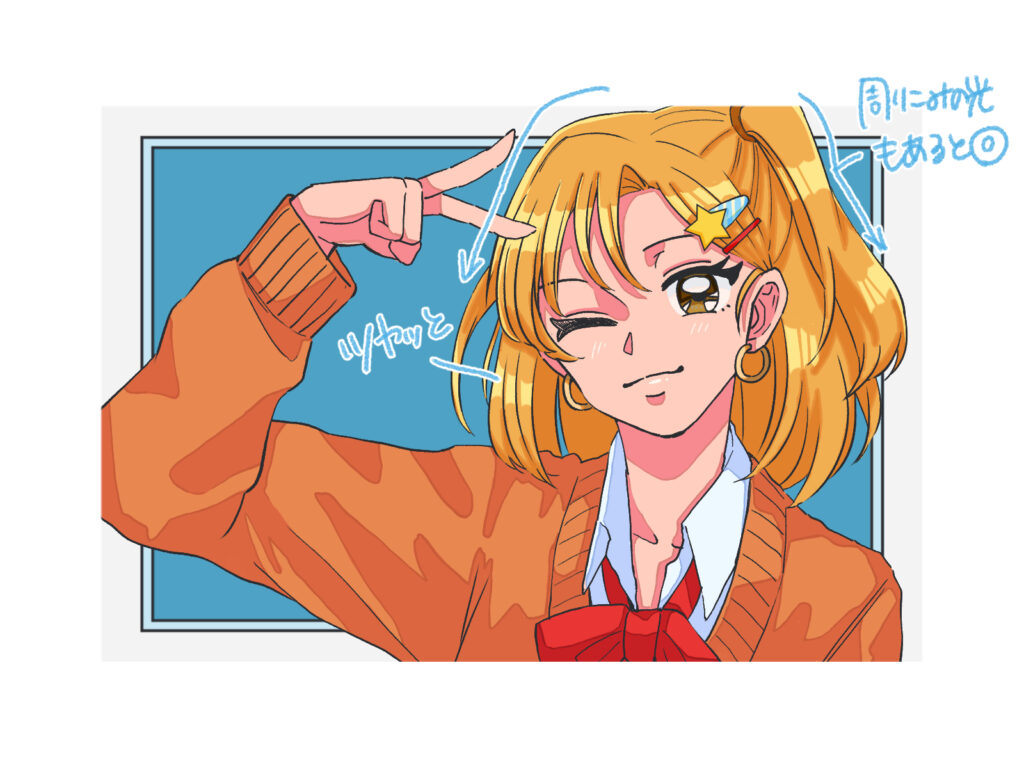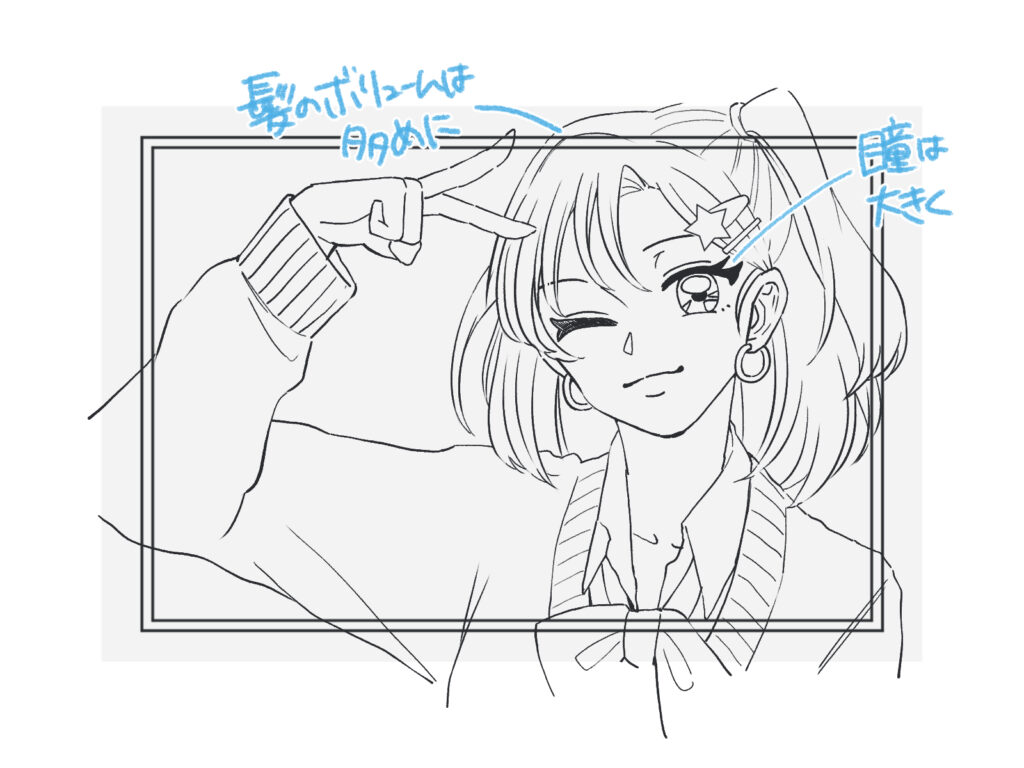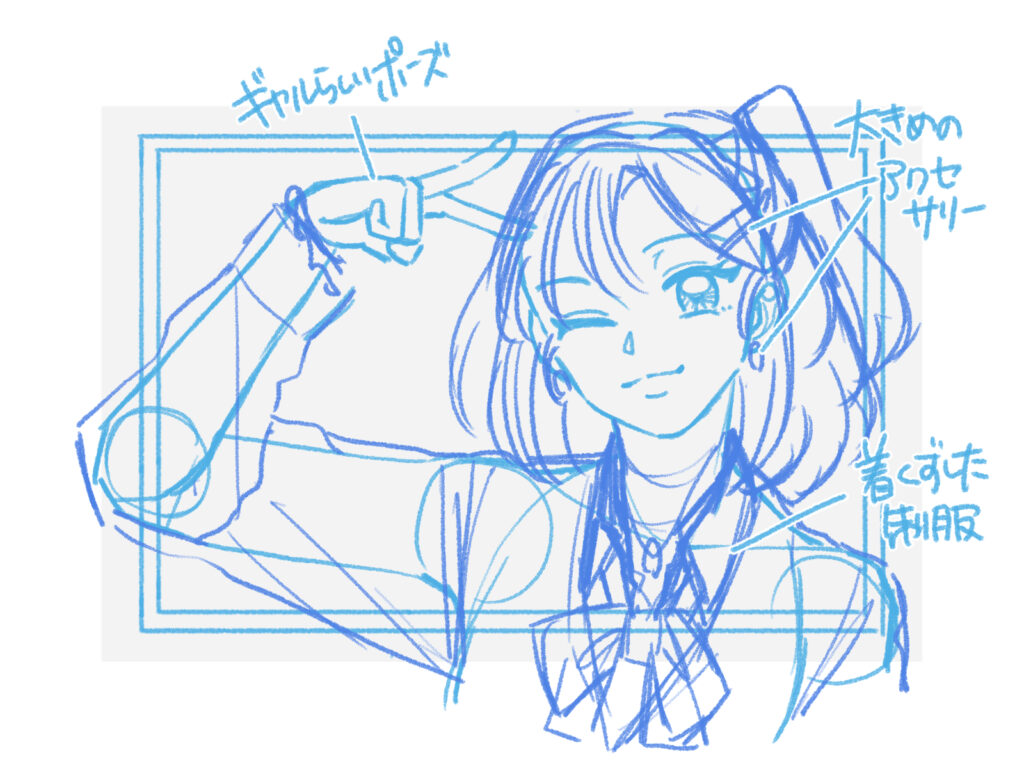 今回は「平成ギャル」をイメージして描いていきます。 ギャルらしいポーズ(ピースサインなど)や、着崩した制服、大きめのアクセサリーを描き込むことで、一気に時代感が出ます。