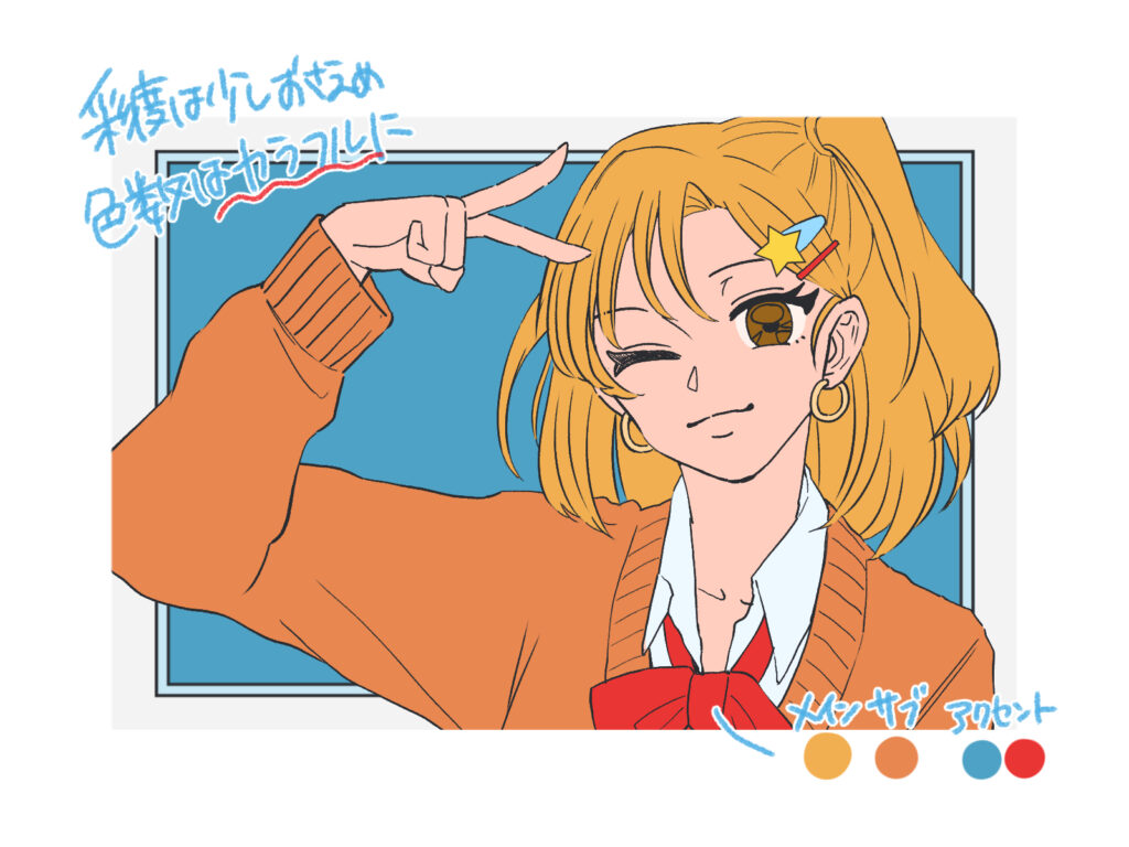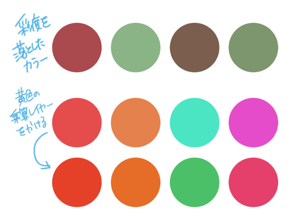 彩度を落としすぎるとイラストが暗く鈍い印象になりやすいので注意してください。