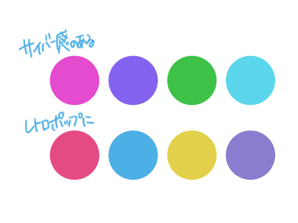 ネオンカラーのような強い色と、淡いパステルカラーを組み合わせるのがコツです。ビビッドカラーを使う際も、完全な原色(R255, G0, B0など)よりは、ほんの少しだけ彩度を調整すると、画面に馴染む「レトロな派手さ」になります。