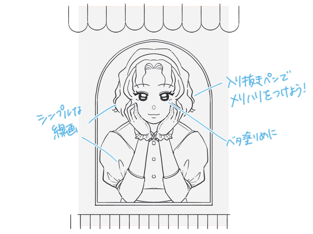 構図を決めたらアタリを取ります。今回は「昭和のアイドル」や「喫茶店」をテーマにします。 例えば、レトロな喫茶店の窓から覗いているイメージでキャラクターを配置してみましょう。枠を描く際は、丸や四角など単純な形にするのがコツです。