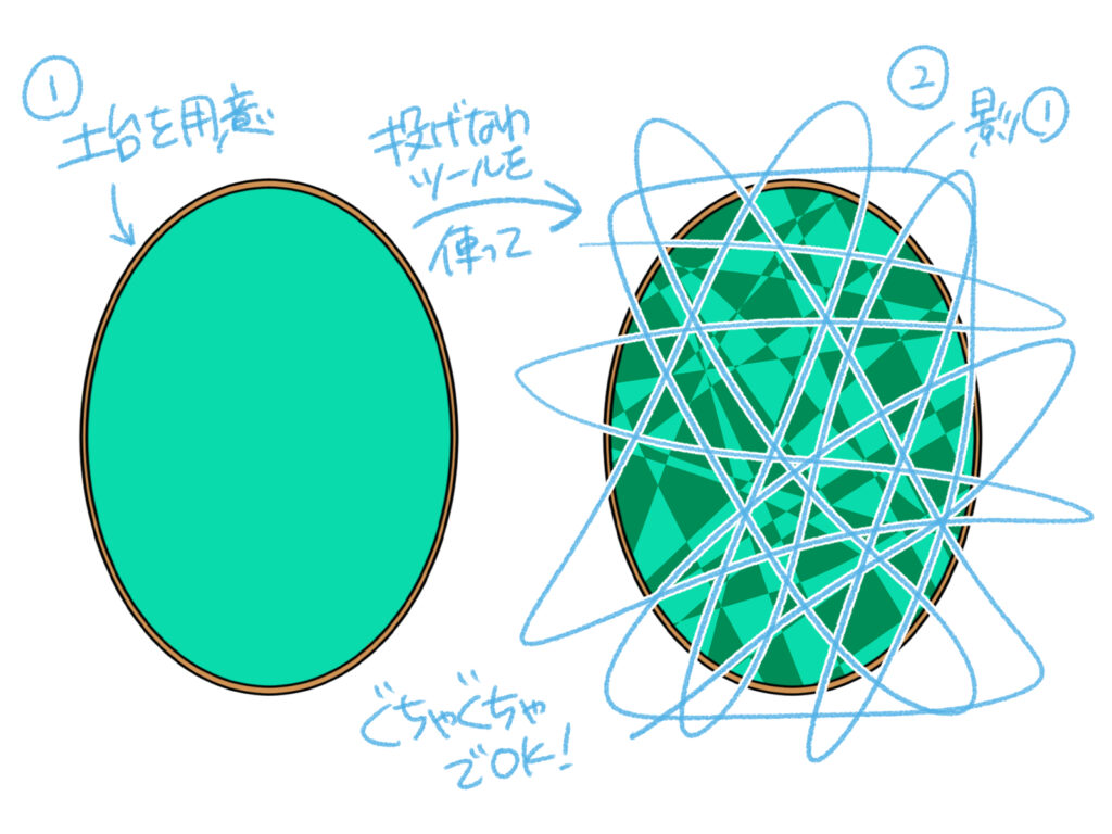 こうすることで、色選びに悩むことなく、宝石特有の透明感とコントラストを簡単に表現できます。