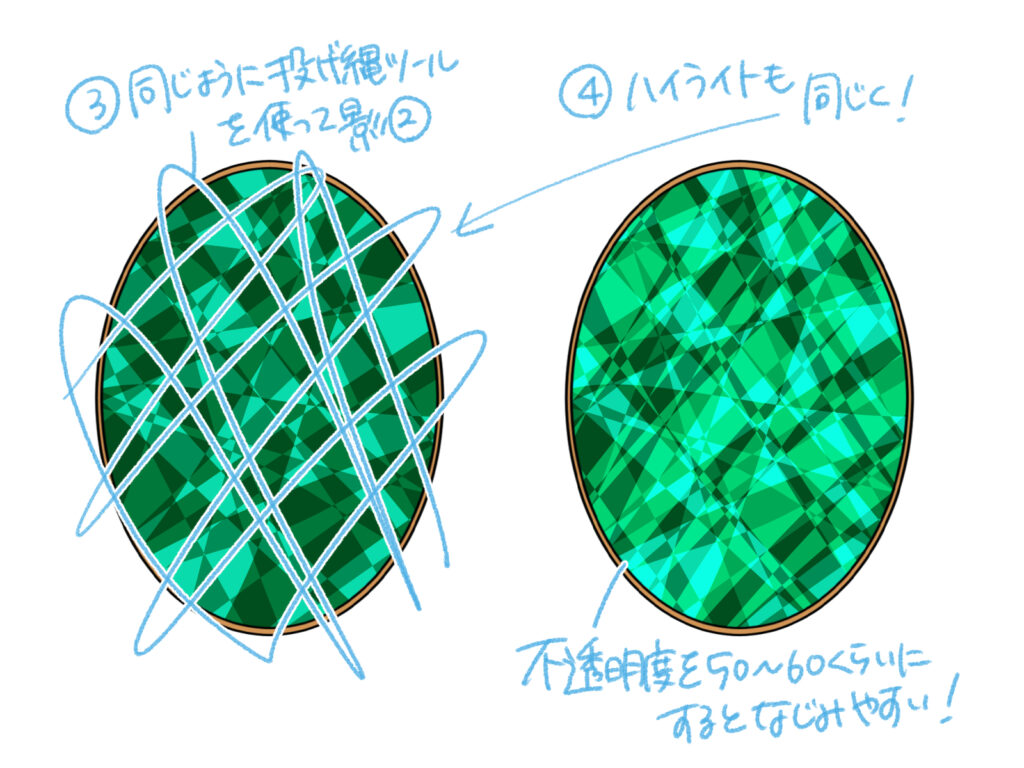 次に、投げ縄ツールを活用して、スピーディーかつ見栄え良く宝石を描くテクニックをご紹介します。