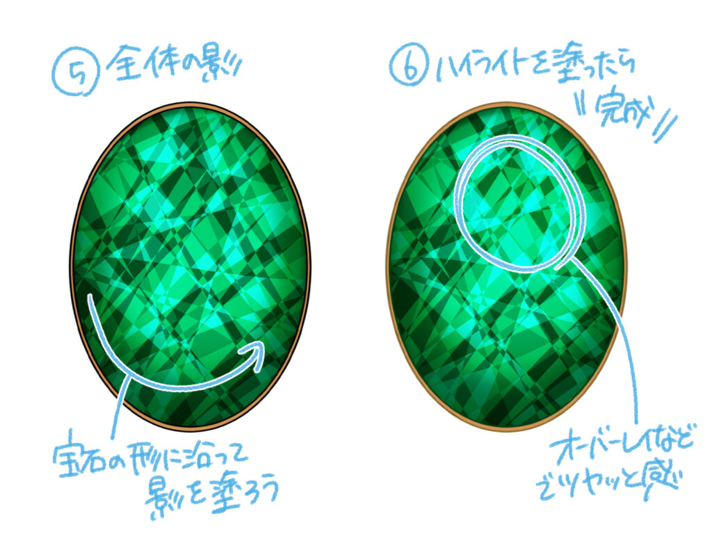 最後に、宝石の丸み(またはカットの形状)を意識して、形に沿った全体的な影を落とします。 一番明るいハイライトをポンと置けば完成です。